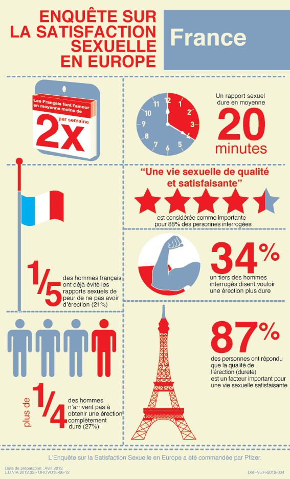 L’étude, qui portait notamment sur 1038 Français (500 femmes et 538 hommes), donne également une vision plus précise de la sexualité dans notre pays. Les Français ont, en moyenne, 6 rapports sexuels par mois et consacrent 3 heures de leur temps mensuel à cette activité.