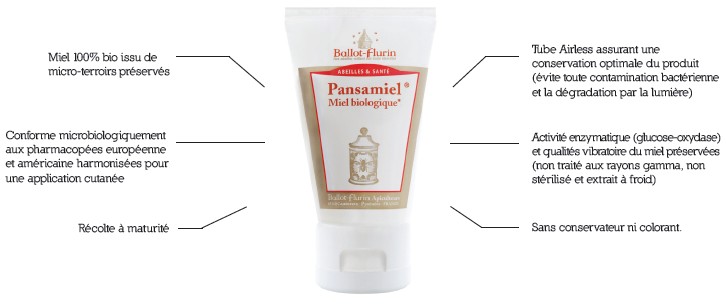 Commercialisé sous forme de tube (pratique et sain), le Pansamiel est constitué de miel 100% bio, sans conservateur ni colorant, bénéficiant d’activité enzymatique (glucose-oxydase) et d’un miel de qualité (non traité aux rayons gamma, non stérilisé et extrait à froid) ; ce nouveau type de pansement est conforme microbiologiquement aux pharmacopées européenne et américaine harmonisées pour une application cutanée.