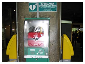 ● Dans les gares SNCF, l’appareil est généralement situé à proximité des espaces Accueil. Dès l’ouverture du boîtier, un appel est automatiquement déclenché vers le centre de secours le plus proche (pompiers de la gare ou SAMU).